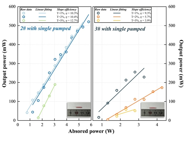 图2 SGGG/Er:SGGG和SGGG/Er:SGGG/SGGG键合激光晶体激光输出结果