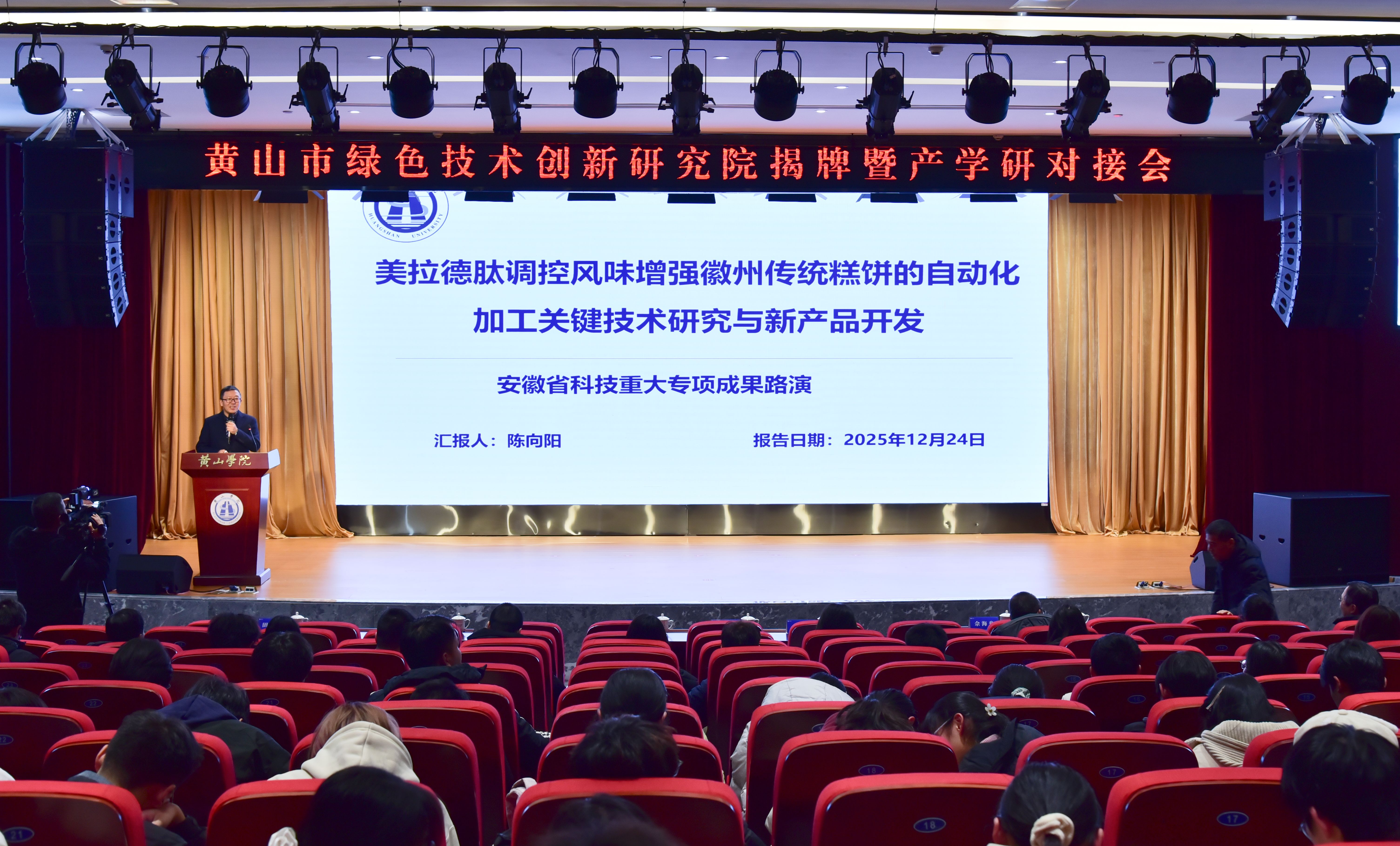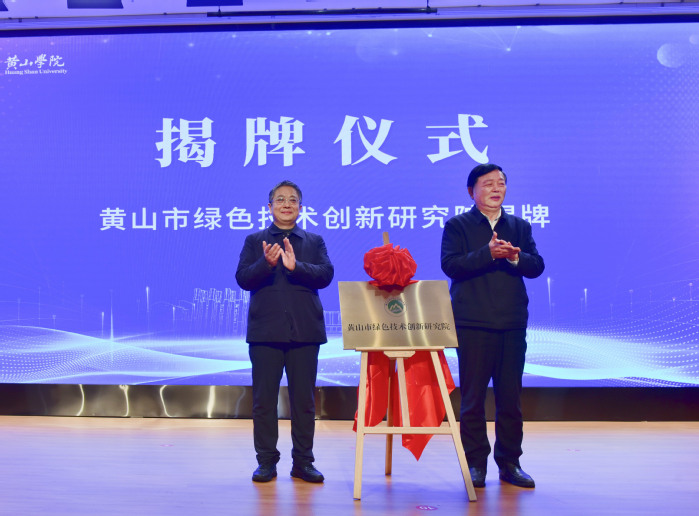 12月24日,黄山市绿色技术创新研究院揭牌仪式暨产学研对接会在黄山学院文博楼二楼报告厅举行。黄山市政协党组书记、市委常委、副市长王恒来,黄山学院党委副书记、院长李庆宏出席活动,并共同为研究院揭牌。会议由副院长姜红主持。