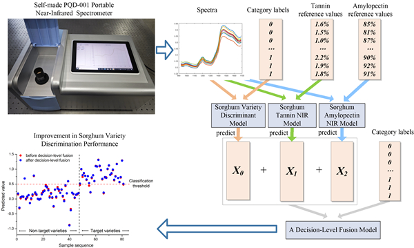 针对此问题,科研人员开发了一种基于决策融合的高粱品种分类算法,利用高粱的两项代表性组分——单宁和支链淀粉的近红外预测值作为支撑信息,与高粱品种分类的近红外预测结果联合分析,共同构成决策融合模型。该方法在提供额外的参考信息之余,还能减少对样本集的依赖,提高不同品种高粱在物质基础上的可解释性,从而有效提高判别精度。该方法以酿酒优级品种“国窖红1号”和“青壳洋”为识别目标,能够有效区分其他高粱品种,取得95.1%的分类准确率。