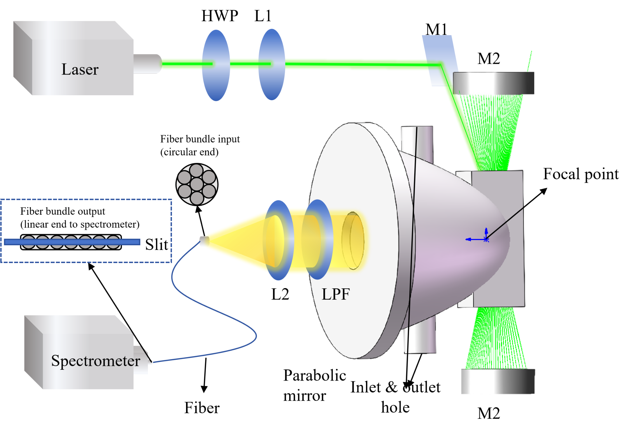 光学结构设计上,团队提出了一种基于抛物面镜的腔增强拉曼光谱检测方法,依托抛物面镜的大孔径特性大幅提升信号收集效率,并对其进行了深度优化(O-PMCERS)。基于拉曼散射强度的角分布模型,精确推导了抛物面镜的最佳几何参数,确立了D=4p(出射孔径等于4倍焦距)的关键设计准则。此外,通过设计独特的环形反射区,构建了高效的闭环光学回路。该优化设计彻底消除了光学系统中的信号收集盲区,并且有效抑制了腔内杂散光的干扰。