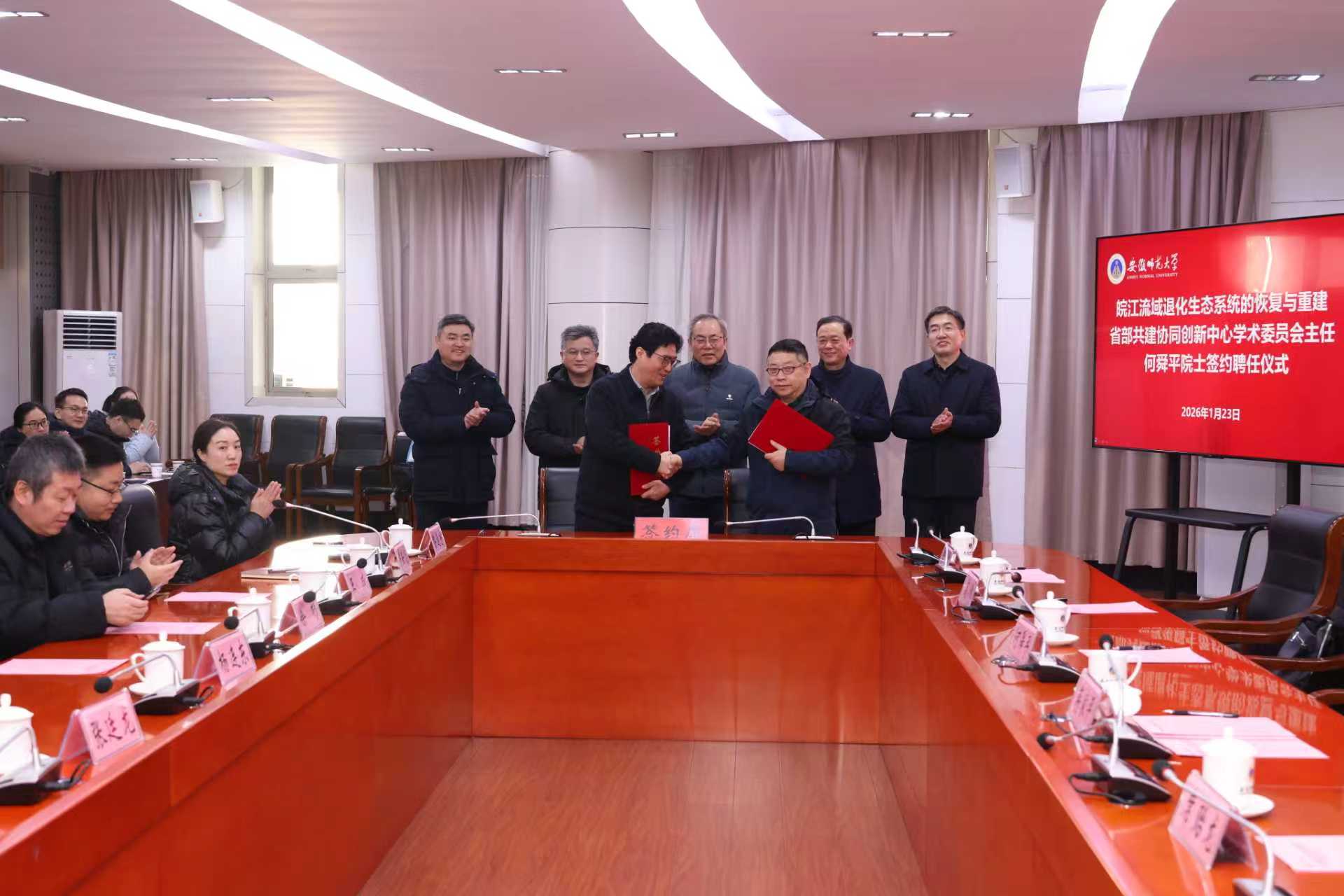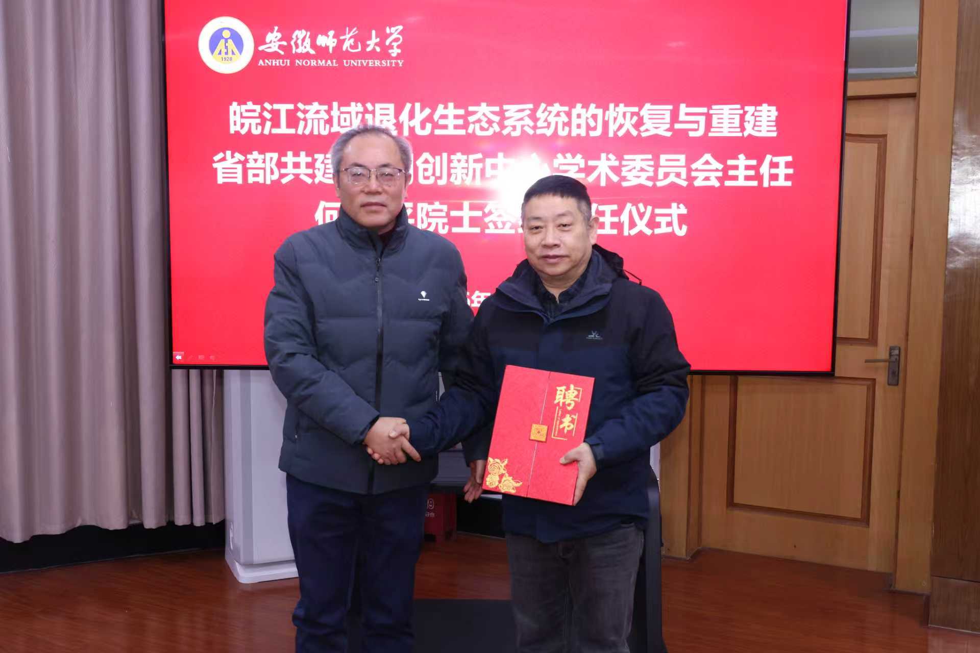 1月23日上午,“皖江流域退化生态系统的恢复与重建”省部共建协同创新中心(以下简称“中心”)学术委员会主任何舜平院士聘任仪式在安徽师范大学花津校区会议中心举行。校党委书记蒋家平,校党委常委、副校长高峰出席仪式,中国科学院水生生物研究所杨连东研究员、王成助理研究员,学校相关职能部门负责人、生态与环境学院党政领导班子、教师代表参加仪式。仪式由人事处处长李宜江主持。
