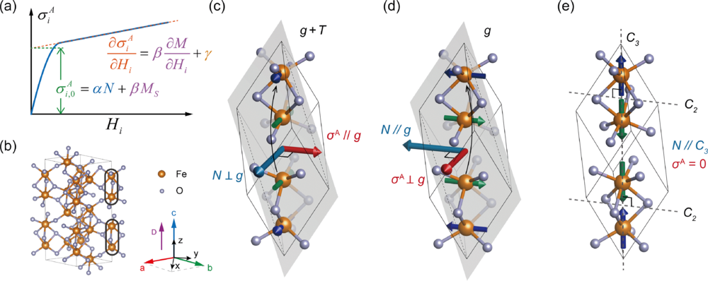 图 1 (a)外磁场扫描下横向光学电导率σiA的结果示意图。(b) 六方晶系中赤铁矿的晶体结构及坐标方向定义((x∥1120, y∥1100 , z∥0001)。(c)-(e)Néel矢量N分别沿x,y,z方向时的磁对称性与对应的σA。Fe原子的相对位置在(b)中标出。