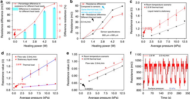 团队采用镓铟合金(EGaIn)作为敏感层材料,其优异的流动性和导电性使其同时承担信号传输与冷却介质双重角色。传感器内部采用蛇形微流道结构,通过外接循环泵驱动液态金属流动,将高温区域的热量迅速带离,使导电组件温度波动控制在较小范围内。实验表明,在2.8W热负载下,液态金属以2.0mL/min流速循环时,传感器电阻较静态工况降低38.1%,且灵敏度达0.11/kPa,最大可测压力为30kPa,该研究为高温环境下的柔性电子技术开辟了新路径。通过流体-结构-热多场耦合仿真与实验验证,团队所研制的传感器在高温环境中表现出卓越的稳定性。在热冲击测试中,液态金属循环使温升幅度显著降低,且连续加载-卸载实验中电阻响应曲线保持高度一致,循环稳定性优异。此外,传感器信噪比高达43.5 dB,确保了信号采集的准确性。
