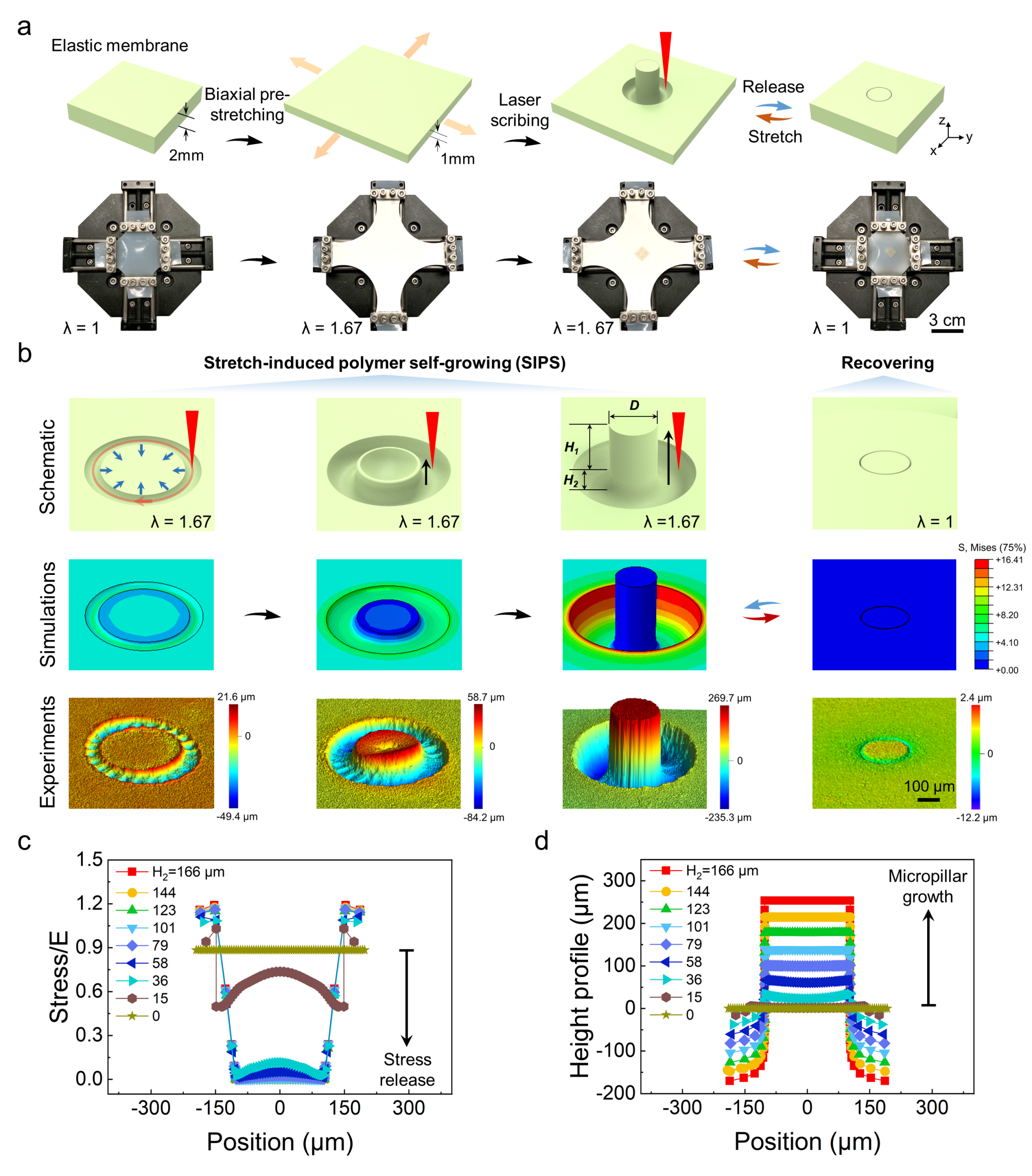 传统聚合物自生长技术普遍存在生长速度慢、结构长径比低、材料适配范围窄以及结构难以实现可逆调控等问题,难以满足微纳制造领域的实际应用需求。针对上述瓶颈,研究团队受自然界动态非平衡体系的启发,将飞秒激光精准刻蚀与弹性薄膜应力调控相结合,提出了一种SIPS新方法。该方法通过对弹性薄膜进行预拉伸,并利用飞秒激光局部刻蚀释放应力,从而驱动聚合物微结构自发生长。基于该策略,成功制备出长径比高达1.4的微柱结构,显著高于此前报道的约0.25。同时,实验结果表明微柱高度与拉伸比及刻蚀深度之间存在明确的定量关系,为微结构的精准设计提供了重要理论依据。进一步的理论仿真表明,微柱高度主要由预应变释放所产生的结构形变所决定,与材料的杨氏模量基本无关。