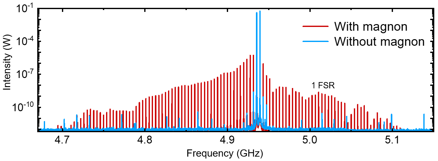 针对上述难题,研究团队通过实验在钇铁石榴石薄膜器件中构建了克尔非线性磁机械系统,该器件支持磁振子模式与多个高次谐波体声波模式耦合,如图1所示。由于该薄膜器件将磁振子和机械声子的模式体积进一步降低,磁非线性系数显著增强,系统在低激发功率下即可清晰观测到的磁振子双稳态现象。得益于显著的非线性效应,研究团队首次成功激发了磁子-声子混合频率梳,并利用外部注入参考微波实现了克尔诱导的频率梳同步现象,最终生成的频率梳带宽超过400MHz,对应的梳齿数目超过130根,如图2所示。这项研究成果为集成磁振子学器件的发展奠定了基础,该器件在片上信号处理和超灵敏检测方面具有巨大的应用潜力,开辟了非线性混合磁振子学研究的新前沿。