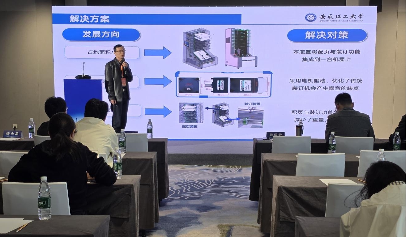安徽理工大学有塌陷区水面种植关键技术及装备产品、智能无钉配页装订一体机、“谐”助安全-电机故障智能诊断系统、新型高灵敏宽频响光纤微震监测仪4项科研成果参加展示推介,其中安理大机电工程学院阮学云教授团队研发的“智能无钉配页装订一体机”入选成果超市重点展示项目,并在高端装备领域专场进行路演。此次参展展示了学校在高端装备制造、智能诊断及矿区可持续发展技术等领域的创新成果,体现了学校产学研深度融合的实践成效。