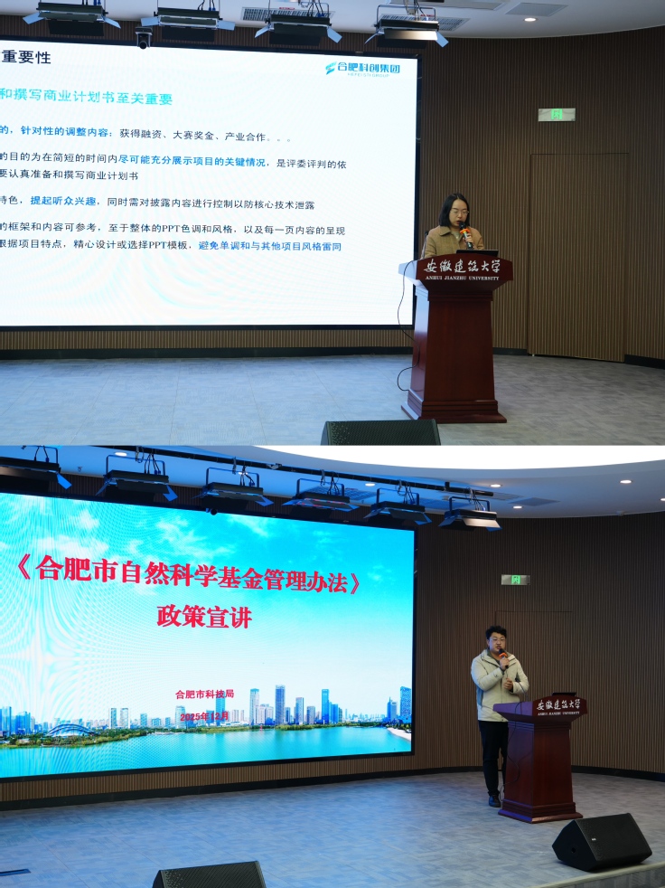 活动现场举行了合肥科创技术经理人实践基地揭牌仪式和合肥市科创集团技术经理人聘请仪式。在政策宣讲及转化培训环节,相关负责人详细解读了合肥市自然科学基金政策,并针对早期项目商业计划书撰写与路演要点开展专项培训,为在场科研团队、创业项目送上精准政策指引与实践启发。设计创意学院钟新老师分享了成果转化创业经验。