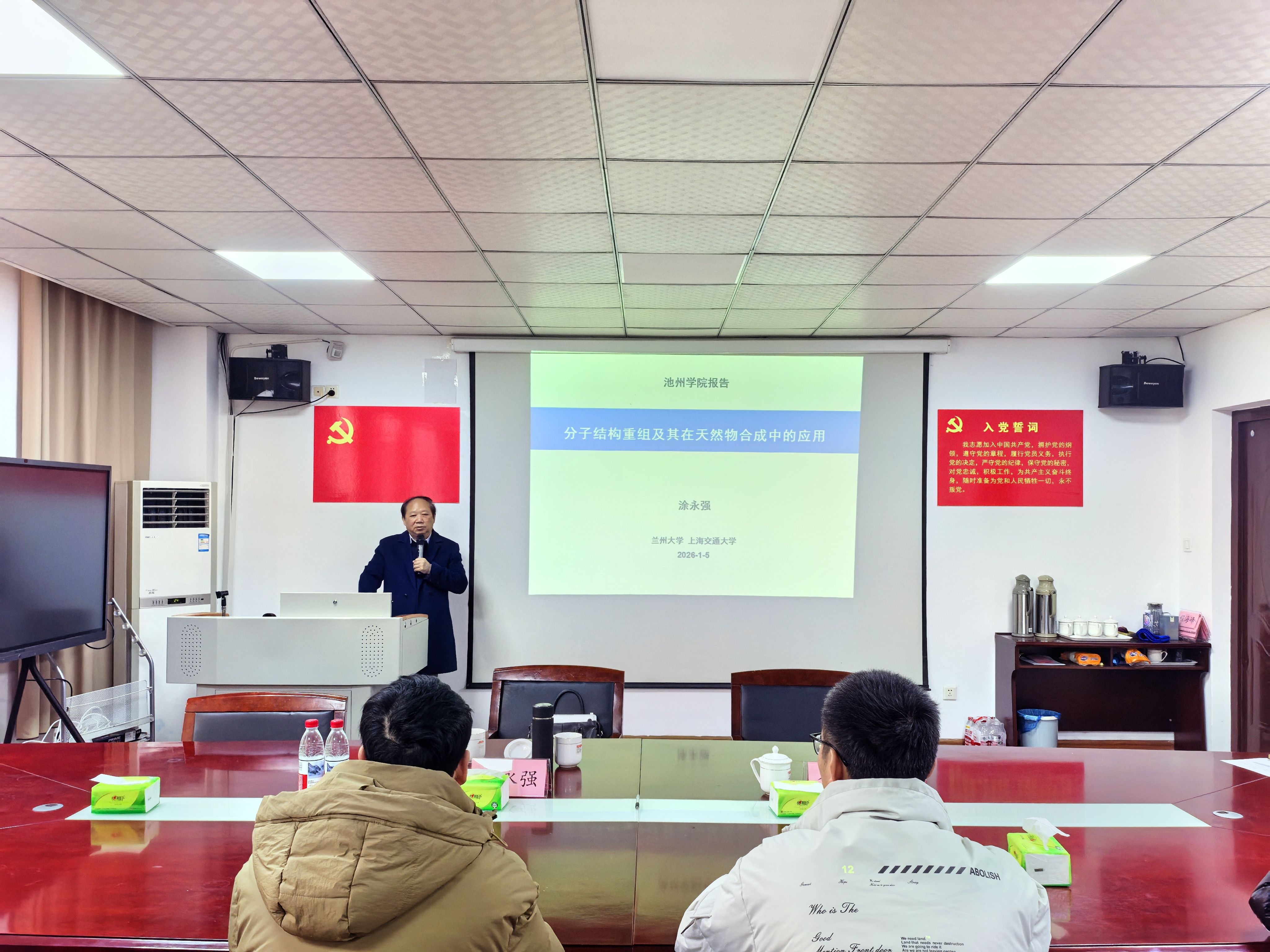 1月5日上午,池州学院材料与环境工程学院“党建引领发展 学术促进成长”学术大讲堂在逸夫南楼会议室举行。兰州大学与上海交通大学双聘教授涂永强院士应邀作题为“分子结构重组及其多环萜类天然产物合成”的学术讲座。讲座由校党委委员、副院长李明玲主持。
