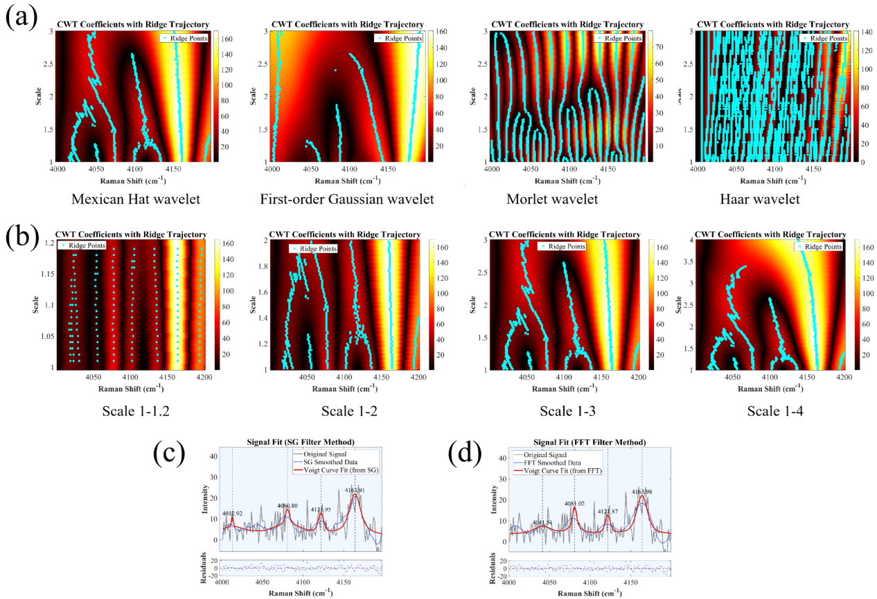算法优化方面,为了在强噪声背景下准确提取痕量气体的微弱信号,团队构建了连续小波变换(CWT)结合Voigt线型非线性最小二乘拟合(NLS)的算法策略。利用“墨西哥帽”小波基函数对光谱进行多尺度分析,通过设定双重阈值有效滤除随机噪声和基线漂移,实现了对低信噪比光谱数据的精准重构。