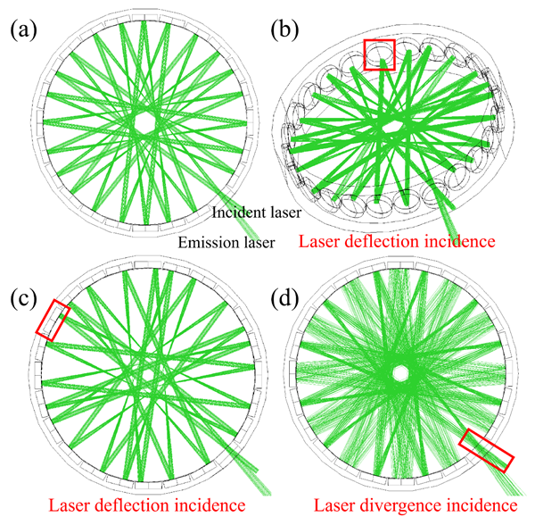 针对上述技术痛点,研究团队构建了一种由23面独立球面反射镜组成的圆形多通腔(C-CERS),所有反射镜焦点都汇聚在圆环的几何中心。这种特殊的共焦结构赋予了系统极高的失准容忍度。光线追踪仿真与实验结果均表明,即使入射激光存在明显的横向、纵向偏移或光束具有较大的发散角,激光束依然能被稳稳地束缚在腔内完成传输,不会发生逃逸。这表明,该系统在复杂的现场环境中具有极佳的稳定性。