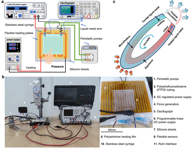 周洲团队聚焦柔性传感器在100℃至150℃高温环境下因材料热变形导致的测量失准问题,通过构建电-质共传的液态金属敏感层循环自冷却系统,显著降低高温对导电组件性能的干扰,为航空航天、特种机器人等高温场景提供了可靠测量方案。