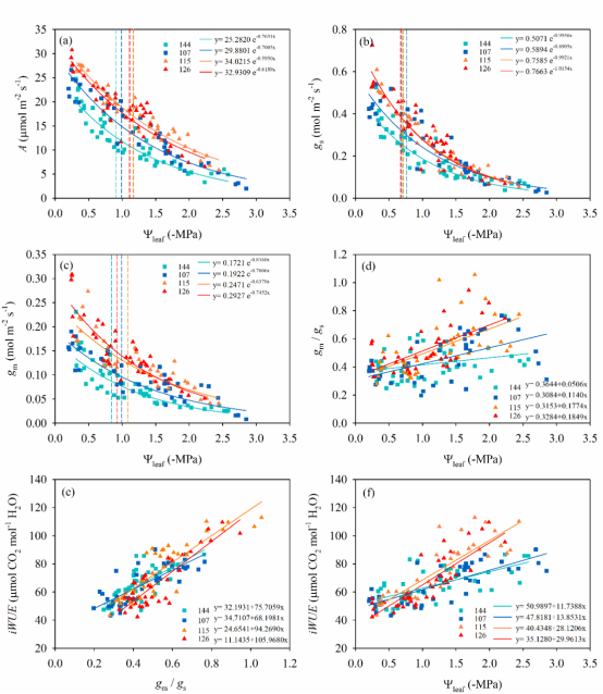 而在干旱胁迫条件下,水稻气孔开度会随干旱程度加剧快速下降,高气孔密度对气孔导度的促进作用逐渐减弱直至消失,但其对叶肉导度的提升效应在整个叶片水势变化范围内均能维持。研究团队发现,高气孔密度可通过增加单位叶面积的气孔下腔面积,扩大 CO2 扩散的有效表面积,从而维持较高的叶肉导度。与此同时,干旱下气孔导度的下降速率显著快于光合速率和叶肉导度,使得水稻光合限制因素向气孔限制偏移,最终实现了光合速率与内在水分利用效率的协同提升。