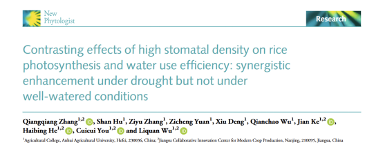 近日,安徽农业大学水稻栽培创新团队武立权教授在植物学经典期刊《New Phytologist》在线发表题为“Contrasting effects of high stomatal density on rice photosynthesis and water use efficiency: synergistic enhancement under drought but not under well-watered conditions”的最新研究成果, 首次系统阐明了气孔密度对水稻光合作用和内在水分利用效率的调控作用具有显著的水分条件依赖性,即 高气孔密度在正常供水条件下仅能提高光合速率,无法实现二者的协同改善,但在干旱胁迫下可协同提升水稻光合速率与水分利用效率。该研究为水稻高产抗旱育种提供了重要的理论依据和关键生理靶标。