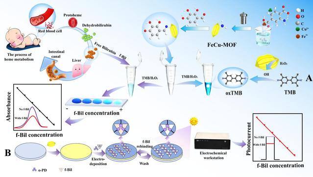 游离胆红素升高可引发新生儿胆红素脑病,现有临床重氮检测法难以区分游离与结合胆红素。科研团队合成特异性识别游离胆红素的羟基化双金属有机框架材料(FeCu-MOF-OH),构建比色与分子印迹光电化学双模式检测平台,10 分钟内可快速筛查,检测限分别低至 0.68 nM 和 1 pM,性能优于现有技术。经临床血清样本验证,该平台快速精准、特异性与稳定性良好,检测结果与临床重氮法高度一致,可为新生儿黄疸早期诊断与治疗监测提供技术支撑,同时相关机理究也为新型纳米酶材料设计提供理论参考。