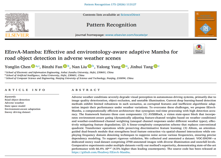 近日,安徽建筑大学电信学院陈永麟老师为第一作者,联合南京林业大学唐金辉教授团队和安徽大学王华彬教授团队,在《Pattern Recognition》上发表题为“EEnvA-Mamba: Effective and environtology-aware adaptive Mamba forroad object detection in adverse weather scenes”的学术论文。《Pattern Recognition》是由Elsevier集团出版的机器学习、人工智能领域国际权威期刊,影响因子8.0,中科院SCI一区TOP期刊。