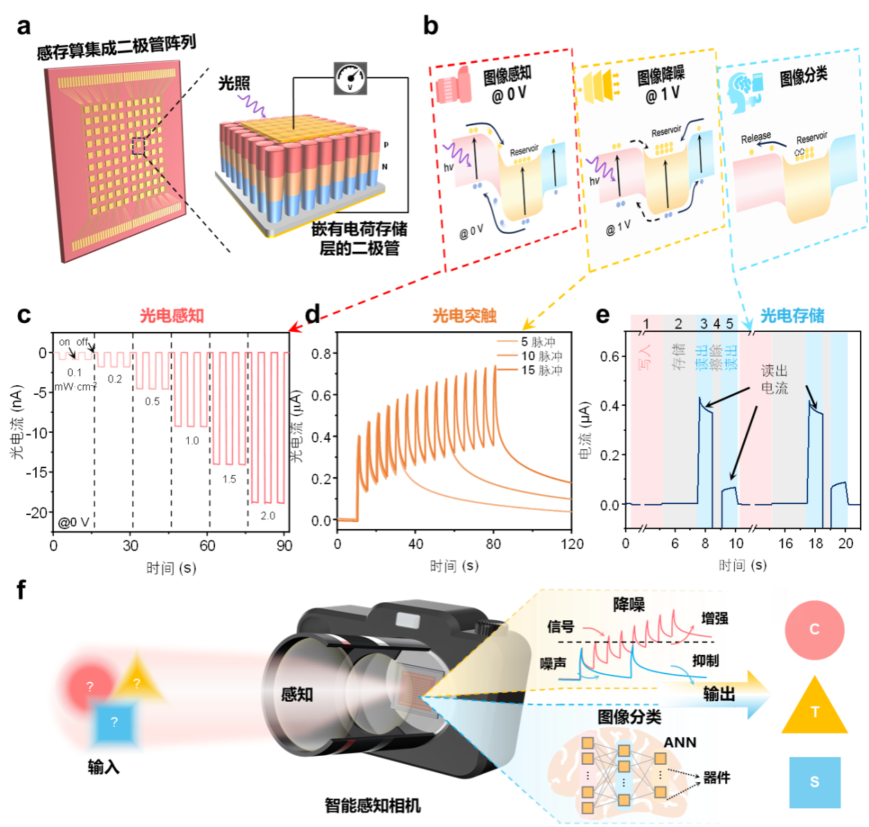 图1:具有感存算一体功能的光电二极管器件性能:(a)感存算集成二极管器件及其阵列示意图,(b)偏压调控的三种功能下器件的能带示意图,其中插入的电荷存储层可通过偏压存储或释放电荷,(c)零偏压下器件在不同光强下的自供能方波光响应特性,(d)恒定偏压下器件在不同光脉冲下的光电突触特性,(e)器件光写入-电压脉冲读出-电压脉冲擦除循环的光电存储特性,(f)基于该感存算集成二极管器件的智能感知相机。