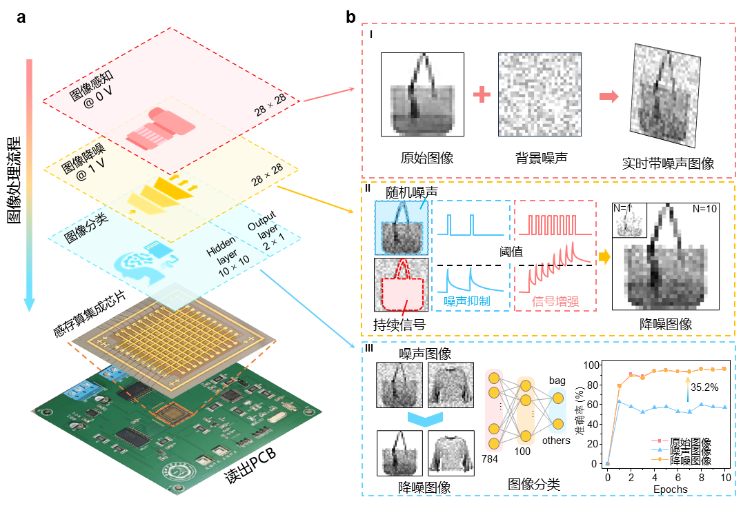 图2:基于感存算集成二极管阵列的智能成像电路系统与应用验证:(a)图像处理流程及成像阵列与读出电路板照片,(b)实时噪声图像感知、图像降噪及图像分类过程示意图。