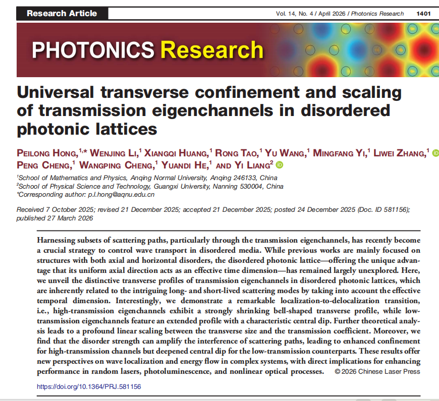 近日,安庆师范大学物理与天文空间学院副教授洪佩龙研究组在光学领域一区Top期刊《Photonics Research》(影响因子7.2)上发表重要研究成果。该工作揭示了无序光子晶格中传输本征通道的局域-离域规律,为复杂散射系统中的光输运调控提供了新思路。