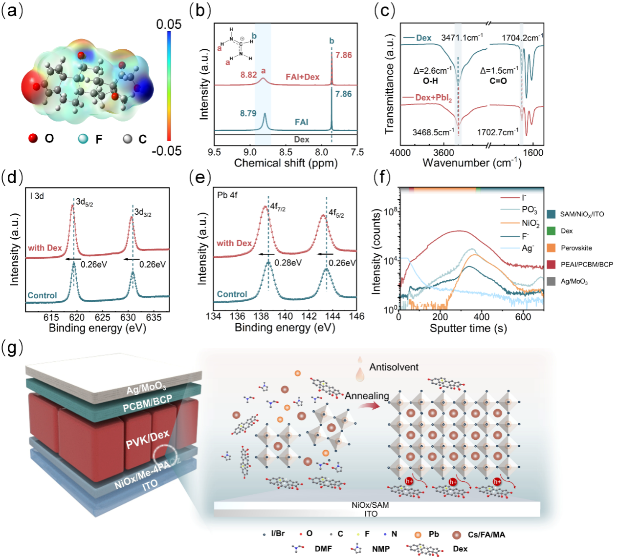 图1.Dex与钙钛矿的相互作用及其界面富集行为