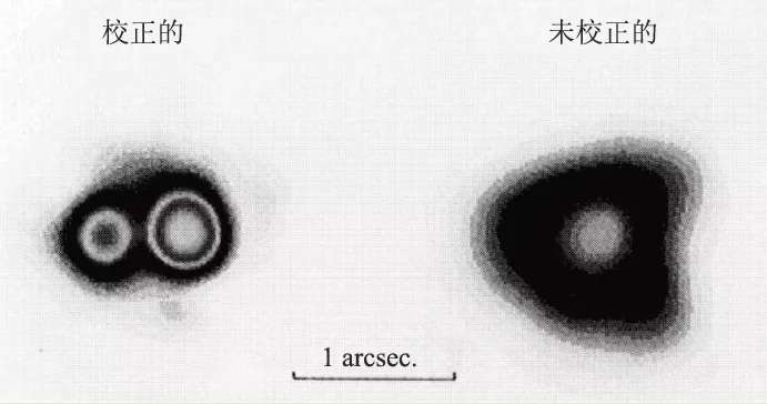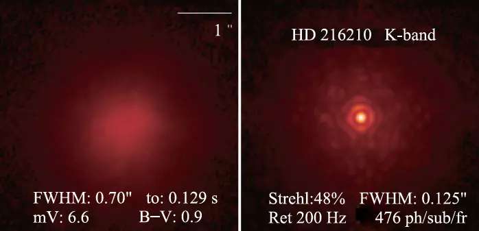 各国的天文学家也在致力于以高分辨率天文观测为目的的研究工作。1989 年,法、德天文学家联合成功实现了自适应光学技术对天体目标的校正与成像,他们将研制的COME-ON自适应光学系统与法国上普罗旺斯(Haute Provence)天文台的1.52 m口径望远镜成功对接,实现了在2.2 μm波长处的衍射极限成像,并对Andromeda γ2 双星(角间距0.55″)进行了观测[8],观测结果如图5 所示。这套系统很快被转移安装到了位于智利的欧洲南方天文台3.6 m 口径新技术望远镜(NTT)上[9],后来发展成为第一台可供使用的自适应光学天文望远镜[10]。图6 所示就是利用这套自适应光学系统(ADONIS)对HD 216210 星(南鱼座,21PsA星)进行观测的结果[11]。