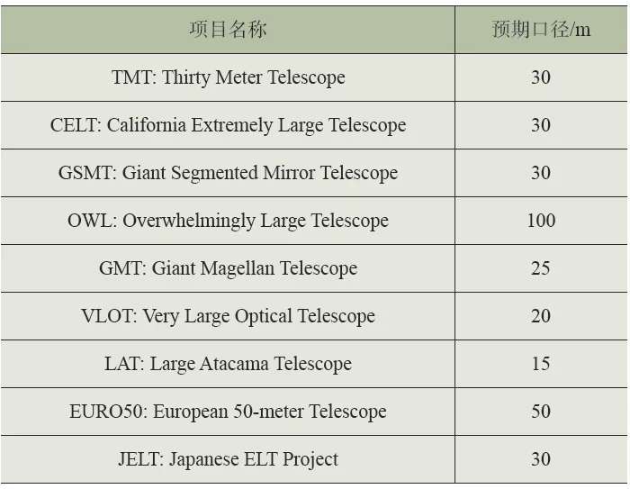 此后近20 年是自适应光学技术飞速发展的时代。各国科研人员通过一系列的理论和实验工作确认了自适应光学技术在空间目标高分辨率观测中的重要地位,自适应光学技术在天文观测、人造卫星观测、空间激光传输等诸多领域的广泛应用取得了丰硕的成果,极大激发了人们的研究热情。几乎所有的大口径光学天文望远镜都采用了自适应光学技术。自适应光学系统已经逐步成为各大天文台所广泛使用的设备,并为下一代更大口径望远镜的建造开辟了道路。尤其是进入21 世纪以来,各国陆续推出了一系列口径达30—100 m的超大型天文望远镜研制计划,如TMT、ELT、GMT等,详见表1。面对全球如火如荼的超大口径望远镜研制浪潮,对自适应光学技术提出了越来越高的要求。自适应光学技术未来的发展也将紧跟天文望远镜的发展步伐,配合下一代超大口径望远镜的制造,解决将会面临的诸如:数万单元高密度波前校正器件与探测器件研制、超大数据量高速波前处理与重构、大视角高分辨率成像、高斯特列尔比观测、可见光波段衍射极限观测、大型系统集成等一系列问题。