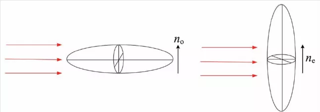 液晶分子通常呈棒状结构。平行于棒的方向和垂直于棒的方向分别被称为分子的长轴和短轴。如果光沿着长轴方向传播,不论其偏振矢量在长轴垂直面上位于哪个方向,显现的折射率都为寻常折射率no;而光波沿着短轴方向传播时,偏振方向不同折射率是各向异性的。当偏振方向沿着长轴方向时,显现的折射率为非常折射率ne(图7)。