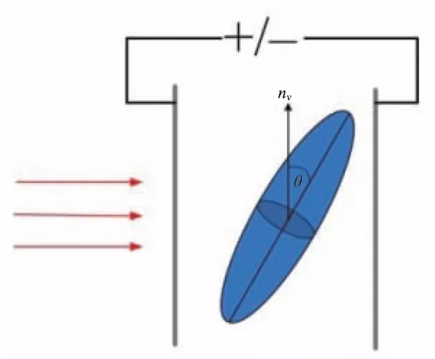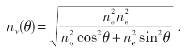 如果将液晶分子放入电场中,在电场的作用下液晶分子会发生转动,转动角θ的大小与施加的外场电压大小成正比(图8)。此时如果一束偏振方向与液晶分子长轴方向平行的线性偏振光入射到液晶层,则液晶对其显现的折射率nν(θ)可以用下式求得: