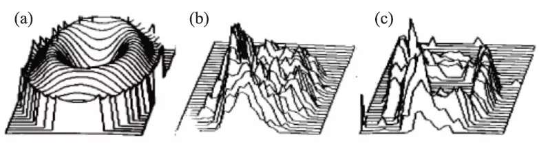 以上优势使得液晶波前校正器具有很好的应用前景。自20 世纪70 年代以来,国内外的很多科研机构都投入到了液晶波前校正器的研究中来。1977 年,I. N. Kompanets 指出可以利用液晶波前校正器对光束进行特定的形貌调制[13]。1981年,S. T. Kowel 等人利用平行排列的液晶盒尝试制作了自适应调节焦距的平凸型柱面透镜[14]。1984 年他们又利用两个前后正交组合的液晶盒,产生两个正交排列的柱面透镜,实现了球形透镜的聚焦效果[15]。1986 年,A. A. Vasilev 等人制出具有16 个校正单元的液晶波前校正器,对光学波前进行了一维校正[16]。1989 年他们又利用1296 像素的光寻址液晶校正器实现了对光束的自适应整形[17],如图9 所示。整形前光斑的强度分布如图9(b)所示,在给液晶施加图9(a)所示的光驱动信号后,光斑的强度分布变成了图9(c)所示的环形分布,整形效果很明显。