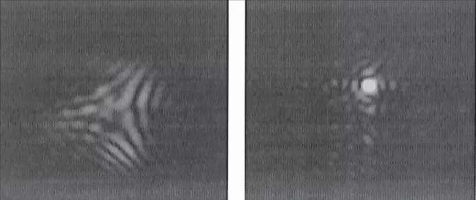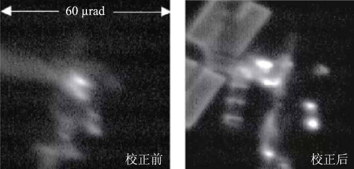 此后,来自美国[21—27]、欧洲[28—32]和日本[33]的许多研究单位都相继开始了液晶波前校正器的自适应光学系统研究。尤为突出的进展就是2002 年由美国应用技术协会与空军实验室采用基于液晶波前校正器的自适应光学系统对亮天体目标和卫星的观测实验[34]。所用的液晶校正器只有91 单元,图11 中所示即为利用这套系统对国际空间站进行的实时观测结果。左图为校正前的国际空间站图像,右图为校正后的图像,其效果充分展示了液晶波前校正器的应用前景。