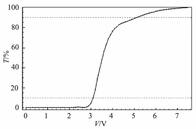 首先,液晶材料在电场驱动下的动态响应存在拖尾现象,因此在传统的显示领域均采用透过率变化10%—90%区间作为响应时间,如图13 所示。然而对于进行波前校正的位相调制来说,这会人为的引入0.1 λ的位相误差,导致波前校正的精度下降。