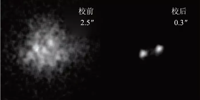 依托上述技术进步,液晶自适应光学系统的能量利用率从5%提高到了85%,系统误差抑制-3 dB 带宽从5 Hz 提升到80 Hz。基于上述技术,我们先后研制了多套与1.23 m、2 m、2.16 m口径望远镜匹配的液晶自适应光学系统,并针对天文目标与人造卫星目标开展了观测实验。图17为与1.23 m口径望远镜匹配的液晶自适应光学系统,图18 为利用该自适应光学系统对α Com双星的观测校正效果,取得了校正分辨率0.18″的观测效果,达到了望远镜的衍射极限水平。