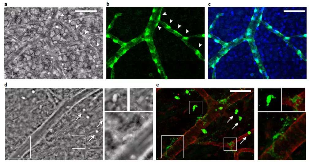 作者观察了大鼠视网膜毛细血管及其周围细胞,并进行了OPI显微镜和荧光共聚焦显微镜的对比研究(如图3)。