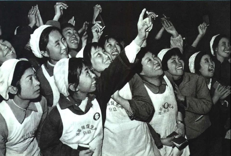 图1是1970年4月25日晚上,北京针织总厂的工人在争相观看经过天安门上空的“东方红一号”卫星,兴奋、喜悦洋溢在她们脸上。