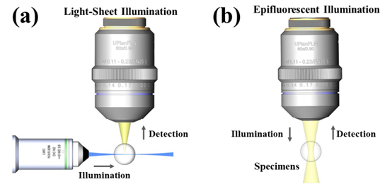 图1 两种显微成像方式对比。(a) 光片荧光显微从侧面用薄光片照明,只激发探测物镜焦平面处的样品发射荧光,在正交方向上收集荧光信号成像;