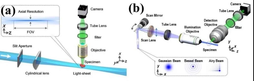 图2 两种光片生成方法的光片荧光显微原理图。(a) 使用柱面镜聚焦方法生成光片;(b) 利用振镜快速扫描光束生成光片。