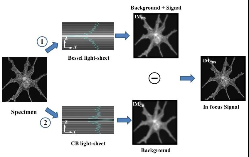 为了解决上述问题,作者团队提出了互补光束相减光片荧光显微成像技术,原理如图3所示,分别用贝塞尔光片和互补光片照明样品拍摄两幅荧光图像,然后将两幅图像相减,可消除贝塞尔光束旁瓣对成像结果的影响,从而实现大视场高轴向分辨率成像[1, 2]。