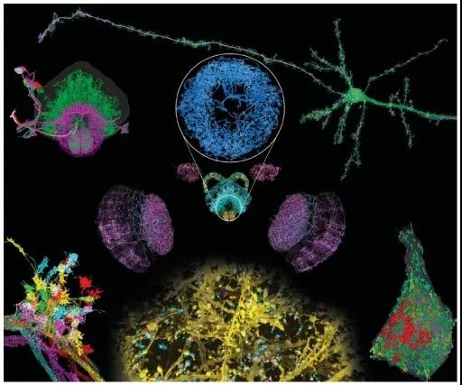 在神经科学领域,对整个大脑进行细胞或亚细胞尺度分辨率的三维无创显微成像,获取全部神经元的位置、形态和行为信息,有利于研究神经回路进而理解脑内过程和神经机制。光片荧光显微是实现小型脊椎动物和无脊椎动物全脑成像的出色工具,如图6所示。