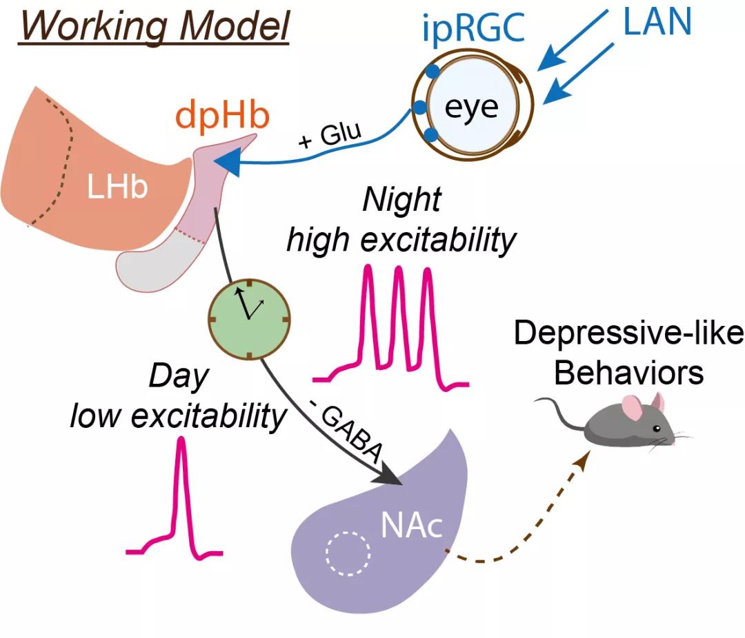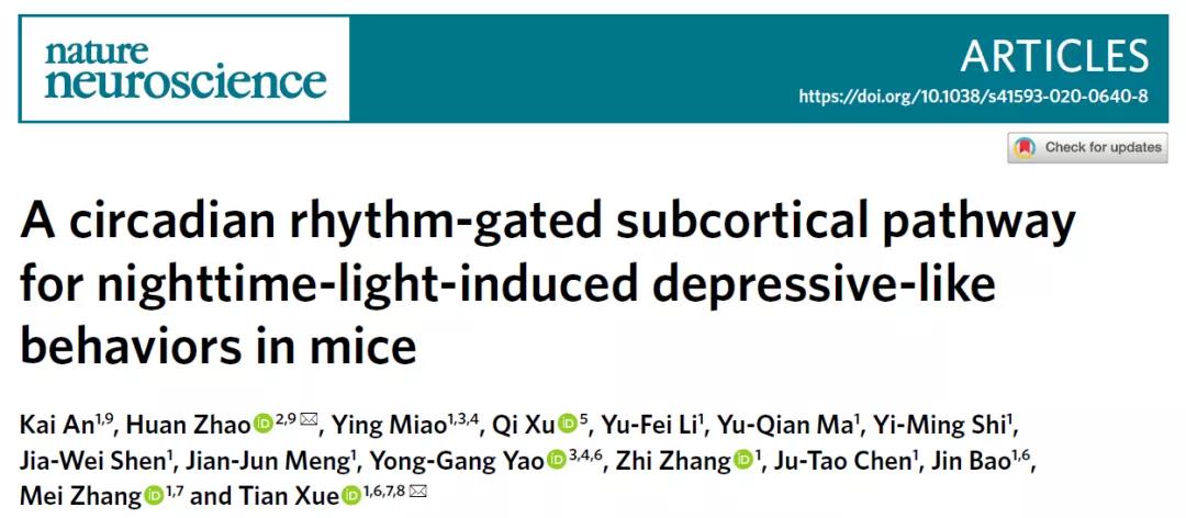 针对这些科学问题,2020年6月1日,中国科学技术大学薛天教授和合肥学院赵欢团队在Nature Neuroscience上在线发表了题为“A circadian rhythm-gated subcortical pathway for nighttime-light-induced depressive-like behaviors in mice”的最新研究成果,首次描述了介导夜间异常光诱发抑郁样表型的神经环路结构与功能;证明了是夜间不正常光线而不是节律或睡眠的紊乱造成抑郁样行为,并且发现了该环路的可兴奋性受到昼夜节律门控调制,首次诠释了光在白昼和夜晚截然相反的情绪作用的内在机理。